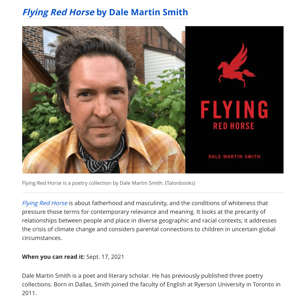 I tell you these things because they compose a personal mythology, and through writing I struggle to ascertain its meaning. I write them to address the blankness, the white strain of the too-familiar residing in so many things now, separated by habits of thought, by surveillance infrastructures, by images and texts detached from stories. How ghosts form and deform, persisting in advance of a feeling. Charley Pride reminds me to listen above and below the vacancy of a surface: “Well people may try to guess / The secret of a happiness / But some of them never learn it’s a simple thing.” – Rob Mclennan reviews RED FLYING HORSE